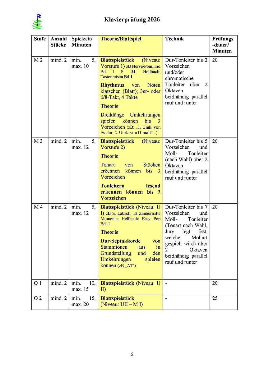 - Angaben über die erforderliche Anzahl der Spielstücke, der Inhalte der Theorie- bzw. Blattspiel- und der Technikprüfung sowie über die vorgesehene Prüfungsdauer sind der Tabelle auf S. 4 zu entnehmen.