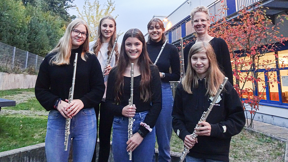 Jede Woche treffen sich Querflötenschülerinnen und –schüler mit ihrer Lehrerin Julia Schelter, um in verschiedenen Besetzungen Kammermusik für dieses Instrument einzustudieren, also auch mit Alt- und Piccoloflöte. Das Repertoire reicht von Barock- über Klassik bis zur Popmusik.