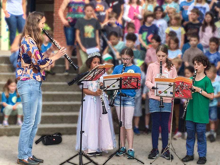 Die Kinder lernen in der AG den Umgang mit dem Instrument: Aus welchen Teilen besteht die Klarinette, wie baue ich sie auf und ab und wie muss sie gepflegt werden? Wir entdecken den vielfältigen Klang der Klarinette und beschäftigen uns mit dem Atemvorgang, der Tonerzeugung, entwickeln Rhythmusgefühl und Fingerfertigkeit, musizieren ein- und mehrstimmig und schnuppern in unterschiedliche Musikrichtungen hinein.