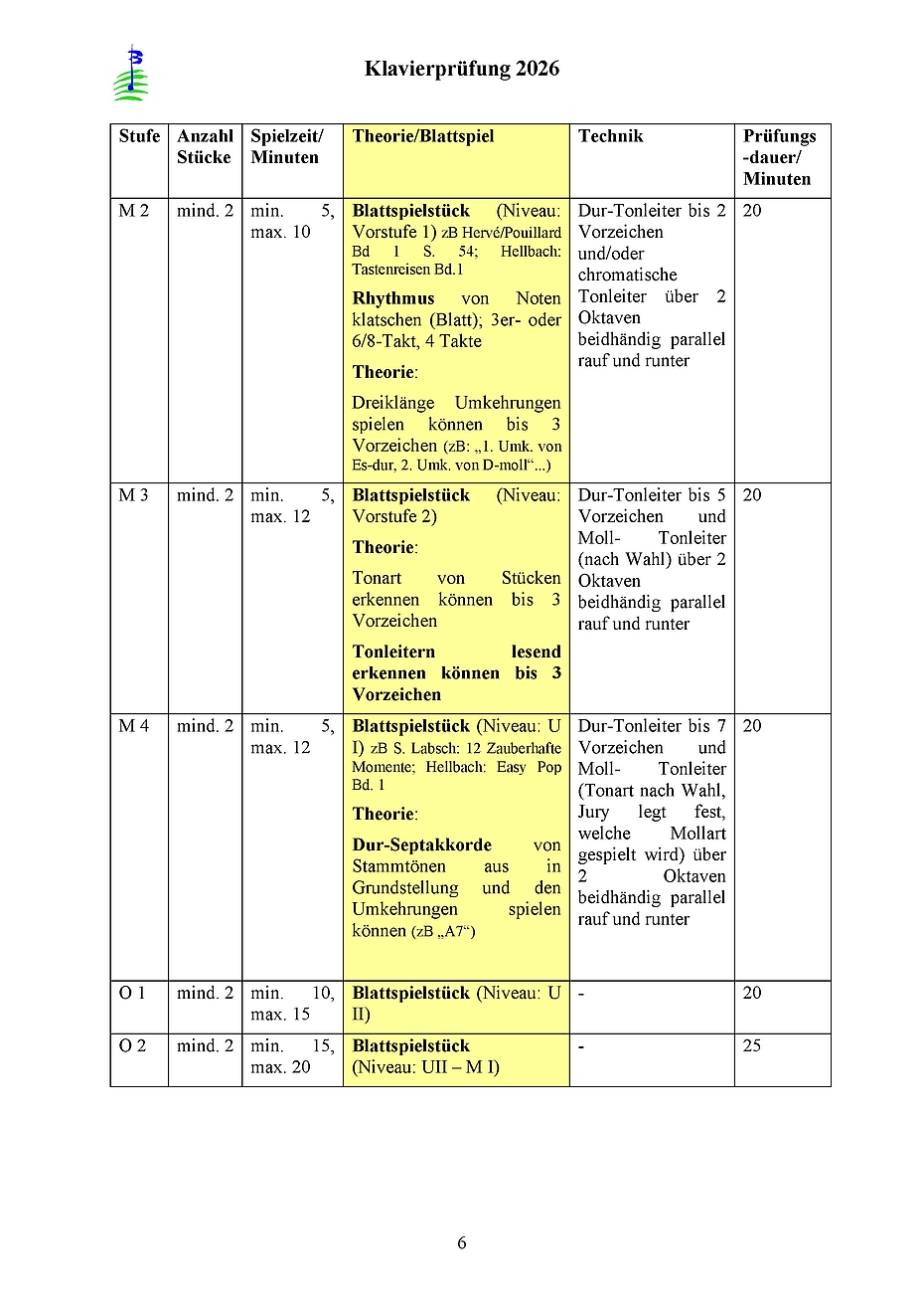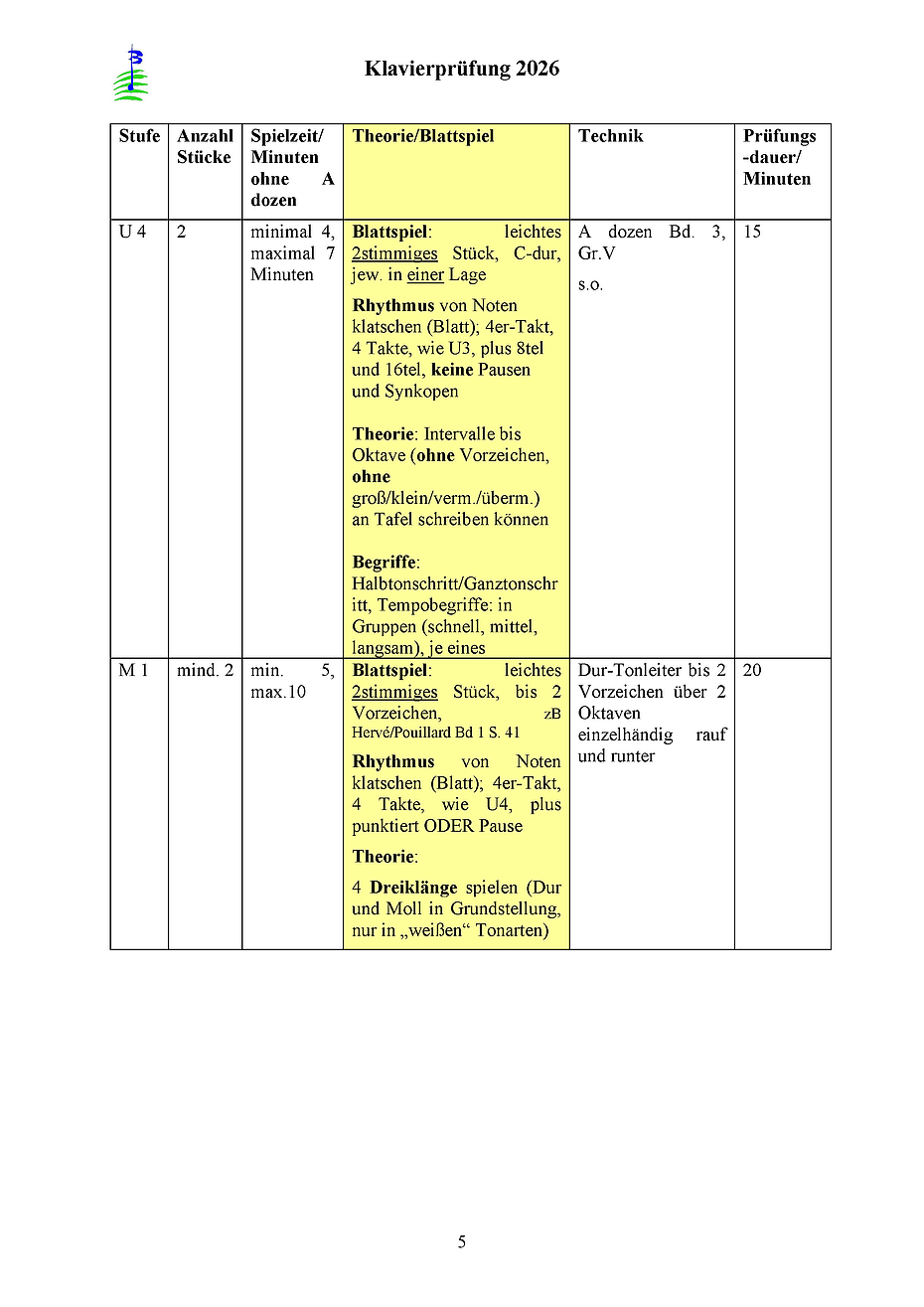 - Angaben über die erforderliche Anzahl der Spielstücke, der Inhalte der Theorie- bzw. Blattspiel- und der Technikprüfung sowie über die vorgesehene Prüfungsdauer sind der Tabelle auf S. 4 zu entnehmen.
