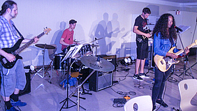 So richtig laut wurde es bei der zweiten Musikschulband Vortex. Sirenen von Madsen kamen laut und derb daher, passend zum Original. Sweet Dreams wurde nicht in der Originalfassung von Eurythmics gespielt sondern in der Heavy –Version von M. Manson. Manuel Wächtershäuser, Franziska Müller (beide E- Gitarre), Constantin Löw am Schlagzeug, Christian Banaszak (E-Bass) und Wolfgang Janich als Sänger beendeten das Konzert mit Enter Sandman von Metallica.