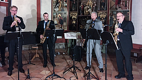 Während wir uns dem Sommer näherten, die Wendelinskapelle unter den schönen Klängen des Quartetts zu vibrieren anfing, erklangen herzliche Liebeslieder, das schmusige „Summertime“ von Georg Gershwin und „Tequila“ für die heißen Tage des Jahres, überzeugend arrangiert von Peter Matejcek. Auch Hochzeitsmusik durfte nicht fehlen: Mit „Babsie´s Freilach“ von Helmut Eiser erweckten die Künstler schwungvoll eine jiddische Vermählung zum Leben. Nach einer Generalpause ging die Melodie dann langsam wieder los mit einer enormen Temposteigerung, welche das Publikum mitklatschen und jubeln ließ. Bei „September“ von Earth, Wind & Fire dann ein spannendes Tenorsaxofonsolo von Alexander Fischer, der ebenso wie Martin Zörb informativ durch das Programm führte. Überhaupt waren auch die anderen einzelnen Stimmen gut akzentuiert. Bernd Niesner, der mit den tiefen Tönen seines Baritonsaxofons die harmonische Basis setzte und teilweise sein Instrument augenzwinkernd einem Schiffshorn ähnlich einsetzte. Peter Matejcek und Martin Zörb, welche sich beim gemeinsamen Altsaxofonspiel die Stimmen zuwarfen. Wenn nicht Martin Zörb mit dem Sopransaxofon noch etwas höher intonierte und dem wunderbaren Quartettklang die Krone aufsetze. Schließlich setzte Saxism die Zuhörerschaft mit dem Narhalla-Marsch wieder am 11.11. und somit im November ab. Viel Applaus, war dieser Jahresrundgang doch ein gelungener roter Faden für ein eindrucksvolles Konzert.